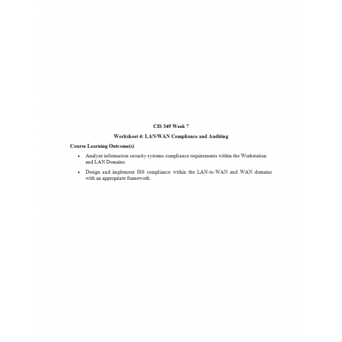 CIS 349 Week 7 Worksheet 4, LAN-WAN Compliance and Auditing
