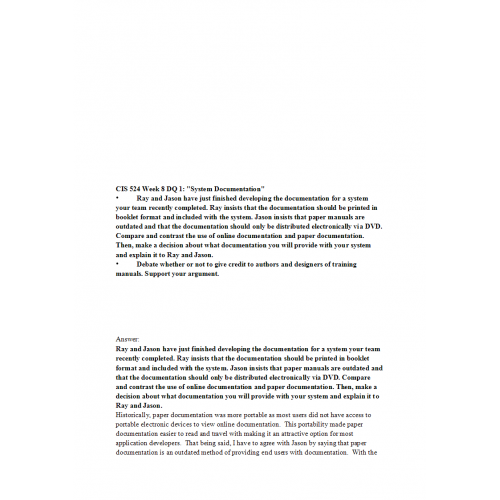 Ray and Jason have just finished developing the documentation for a system your team recently completed. Ray insists that the documentation should be printed in booklet format and included with the system. Jason insists that paper manuals are outdated and that the documentation should only be distributed electronically via DVD. Compare and contrast the use of online documentation and paper documentation. Then, make a decision about what documentation you will provide with your system and explain it to Ray and Jason.