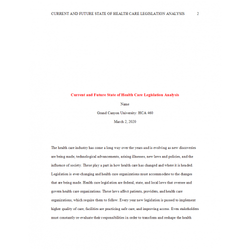 HCA 460 Week 8 Assignment, Current and Future State of Healthcare Legislation Analysis