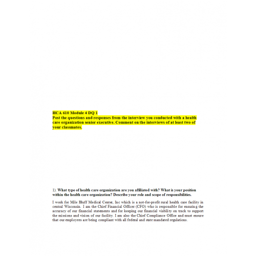 Post the questions and responses from the interview you conducted with a health care organization senior executive. Comment on the interviews of at least two of your classmates.