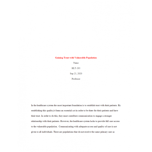 HLT 205 Week 6 Assignment, Gaining Trust with Vulnerable Population 1