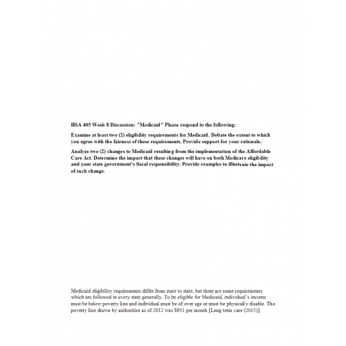 HSA 405 Week 8 Discussion: "Medicaid" Please respond to the following: