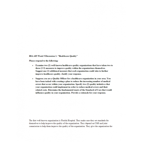 HSA 405 Week 9 Discussion 1: "Healthcare Quality"