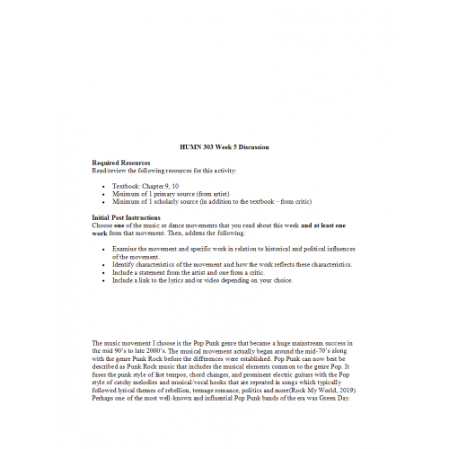 Choose one of the music or dance movements that you read about this week and at least one work from that movement. Then, address the following: