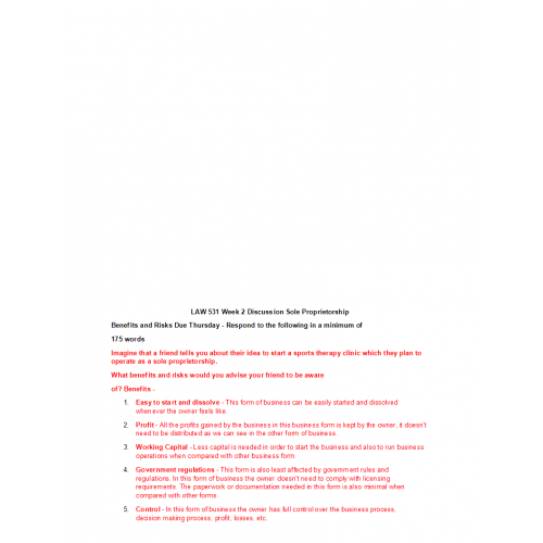 LAW 531 Week 2 Discussion, Sole Proprietorship Benefits and Risks