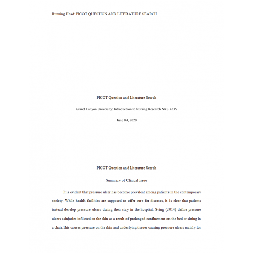NRS 433V Week 1 Assignment, PICOT Question and Literature Search (Pressure Ulcers)