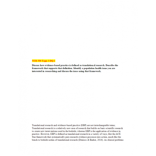 Discuss how evidence-based practice is defined as translational research. Describe the framework that supports that definition. Identify a population health issue you are interested in researching and discuss the issue using that framework. As you select an issue, remember you will be building upon your research in this course for your evidence-based practice project in the next course. Think about how you can focus your research now to help you complete your EBP project. Note: While you will only be proposing a solution and implementation plan in your EBP project, keep in mind EBP projects lay a foundation for doctoral research, since doctoral candidates have the opportunity to actually implement their projects. If you are interested in pursuing doctoral education, it is a good idea to choose an issue you would be interested in pursuing in greater depth. The research and work you complete on your EBP project now can be used if you choose to move forward into doctoral education.