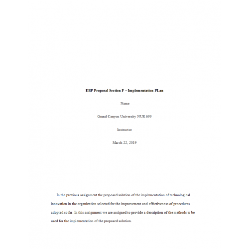 NUR 699 Week 5 Assignment 2, Evidence-Based Practice Proposal – Section F: Implementation Plan