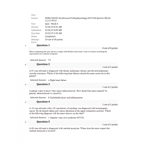NURS-6501N-46,Advanced Pathophysiology Week 4 Quiz Fall 2019 (29 out of 30 points)