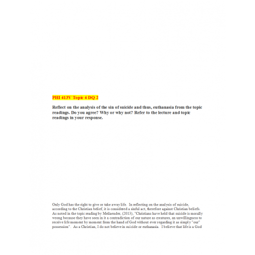 Reflect on the analysis of the sin of suicide and thus, euthanasia from the topic readings. Do you agree? Why or why not? Refer to the lecture and topic readings in your response.