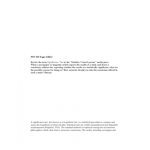 Review the term Significance Test in the "Statistics Visual Learner" media piece.When a newspaper or magazine article reports the results of a study and draws a conclusion without also reporting whether the results are statistically significant, what are the possible reasons for doing so? How seriously should you take the conclusion offered in such a study? Discuss.