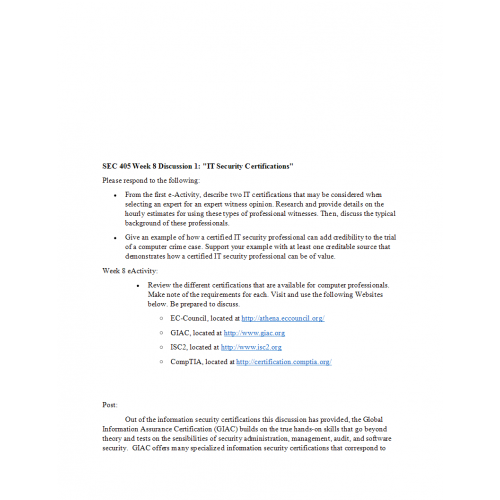 SEC 405 Week 8 Discussion 1: "IT Security Certifications"