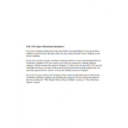 If you have children already, was that a conscious choice or was it just assumed that you would have children? If it was a choice, how did your reasons for wanting children compare with the reasons discussed in Chapter 12 of the Lauer & Lauer text? If it was not a thought-out choice, do some of the reasons discussed in the text help explain why you and your spouse did not “choose” to have the children you have? Explain.