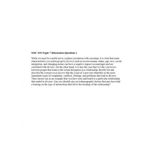 While we must be careful not to confuse correlation with causation, it is clear that some characteristics (sociodemographic factors) such as socioeconomic status, age, race, social integration, and changing norms can have a negative impact on marriages and are correlated with divorce. On the other hand, it is also the case that it is the interaction between people that leads to the actual disruption in a relationship. Briefly list and describe the interpersonal factors that the Lauer & Lauer text identifies as the more immediate types of complaints, conflicts, feelings, and problems that lead to divorce. Then choose one as an example that you have seen and heard in a particular relationship that ended in divorce. Can you identify any sociodemographic factors that may have had a bearing on the type of interactions that led to the breakup of the relationship?