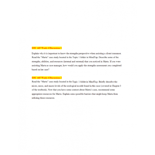 Explain why it is important to know the strengths perspective when assisting a client/consumer. Read the “Marta” case study located in the Topic 1 folder in MindTap. Describe some of the strengths, abilities, and resources (internal and external) that you noticed in Marta. If you were assisting Marta as case manager, how would you apply the strengths assessment you completed based on her case?