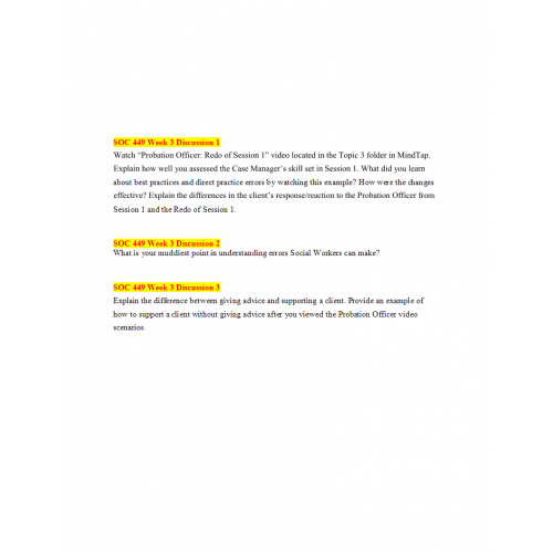 1. Watch “Probation Officer: Redo of Session 1” video located in the Topic 3 folder in MindTap. Explain how well you assessed the Case Manager’s skill set in Session 1. What did you learn about best practices and direct practice errors by watching this example? How were the changes effective? Explain the differences in the client’s response/reaction to the Probation Officer from Session 1 and the Redo of Session 1.